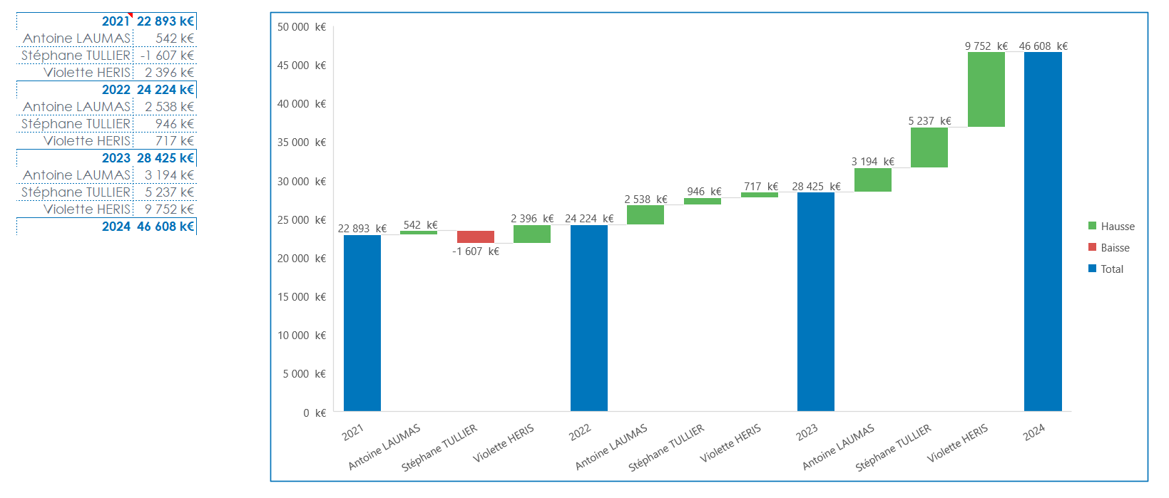 Le graphique Waterfall généré indique les écarts par commercial sur 3 années, il est finalement la représentation visuelle de ce tableau :