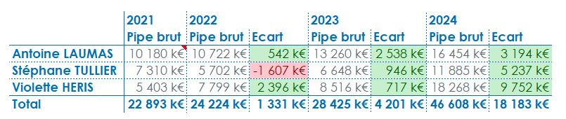 Ce graphique indique les écarts de Pipe Brut par commercial entre 2 années.