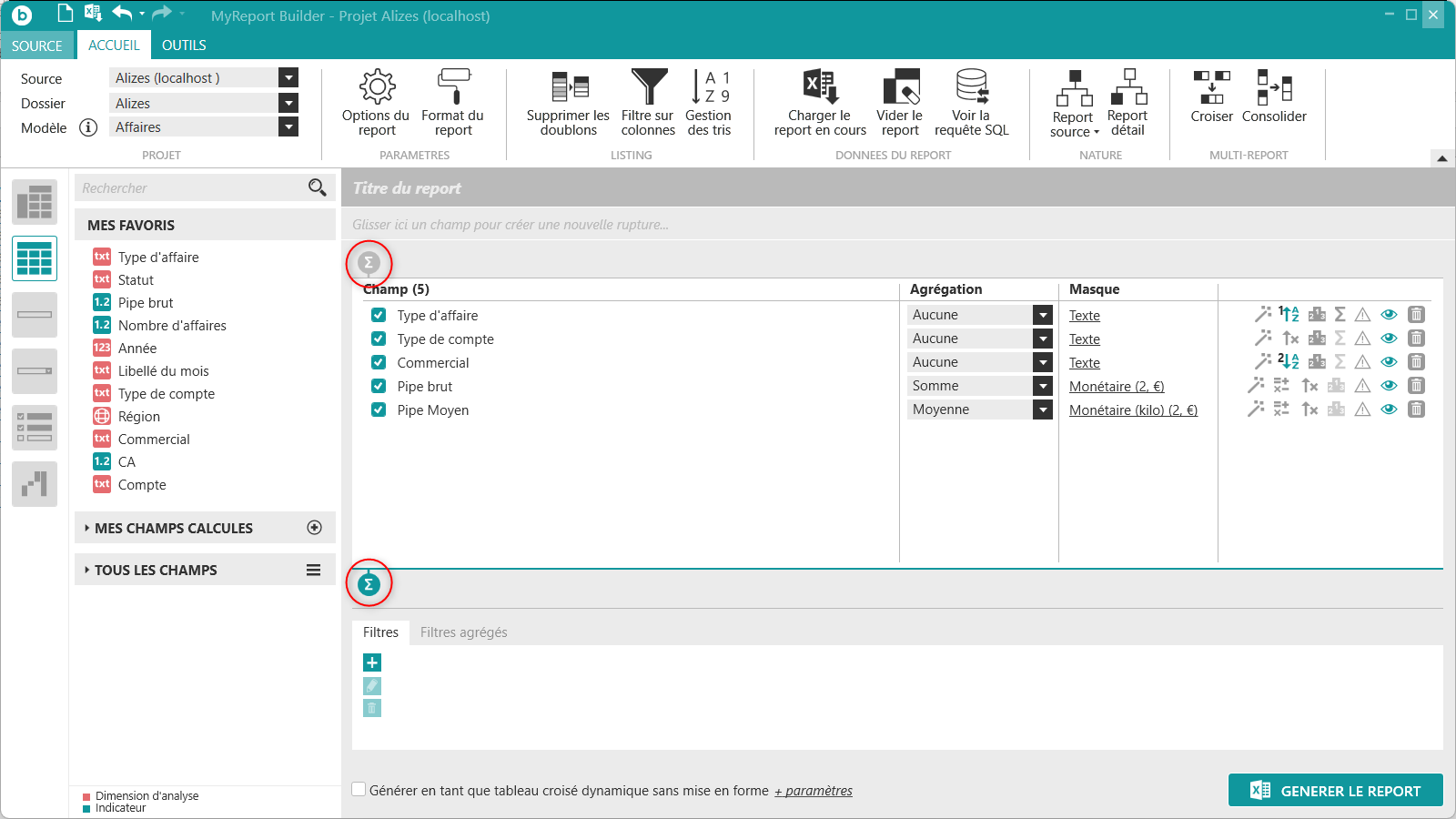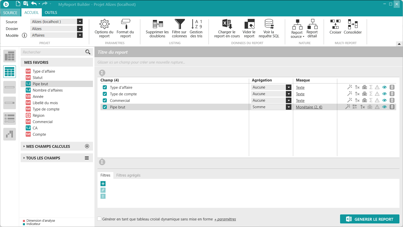 Puis positionnez dans votre report les champs suivants du modèle Affaires :