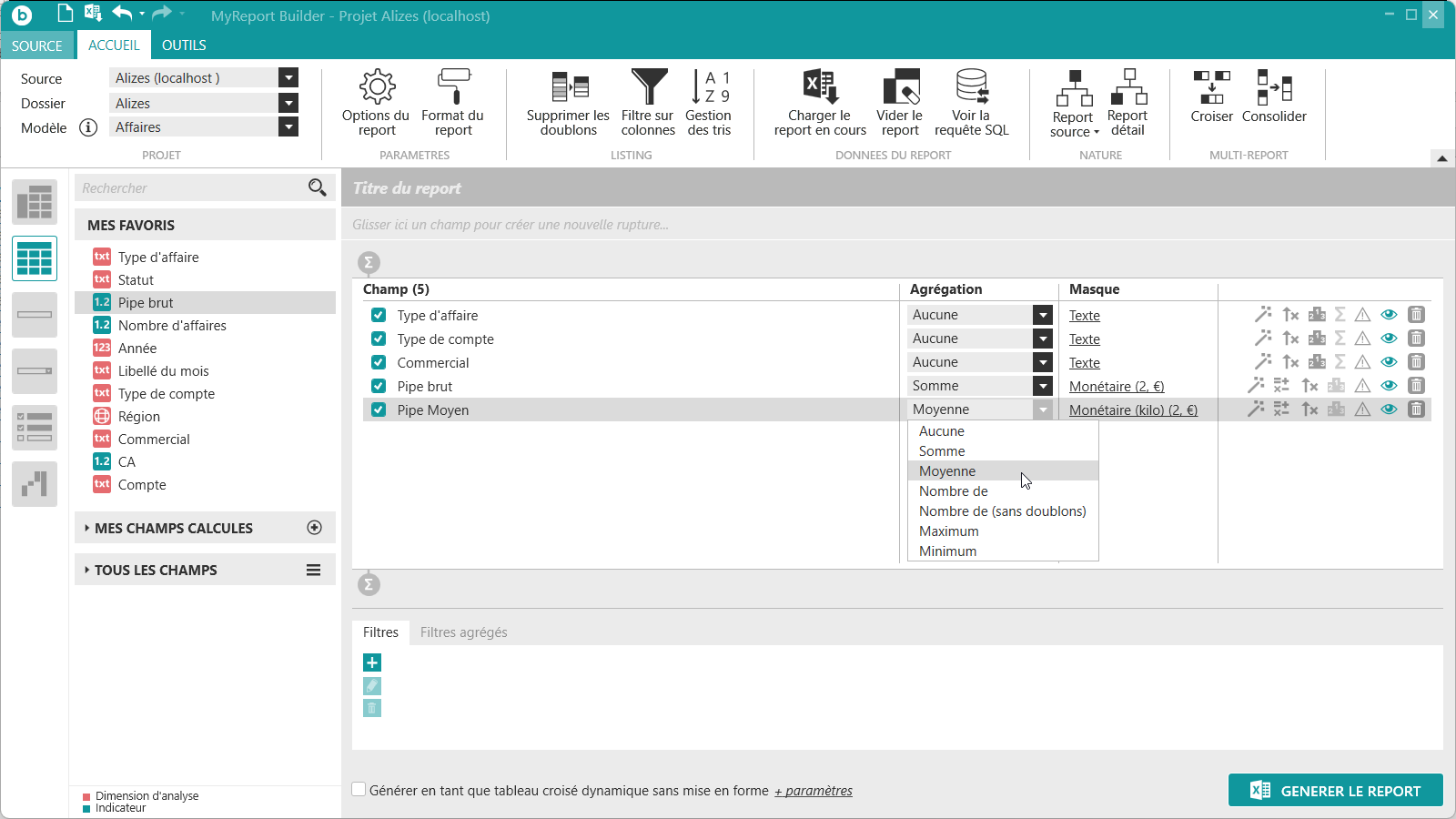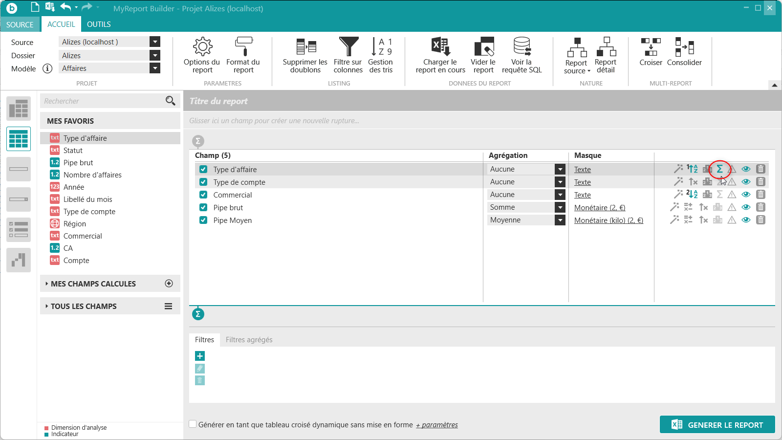 L'agrégation "Par défaut" reprend l'agrégation du champ (Somme, Moyenne, etc.) dans le report. Elle peut être modifiée.