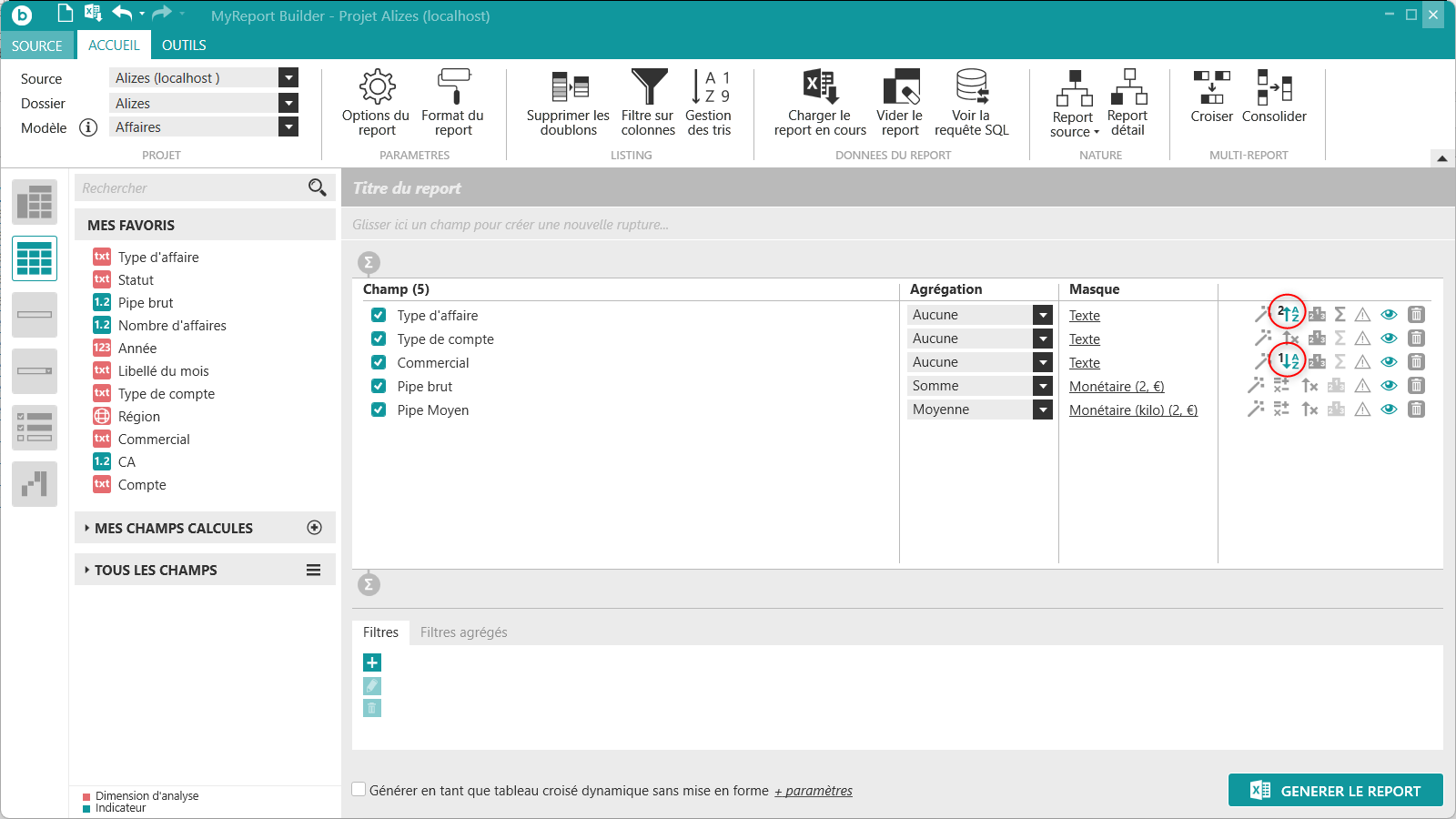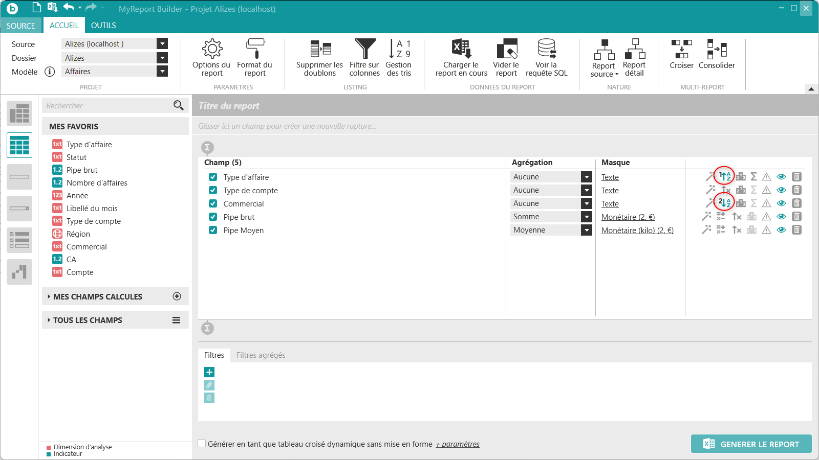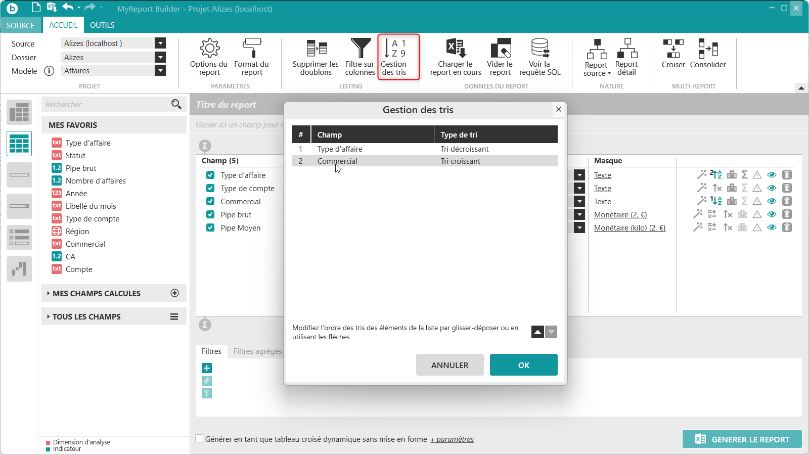 Réaffichez MyReport Builder, nous allons maintenant trier par « Commercial » croissant (tri de A à Z), et par « Type d'affaire » décroissant (tri de Z à A).