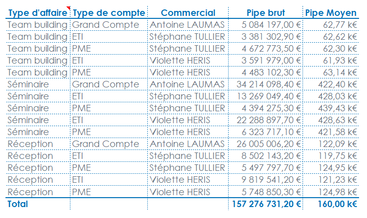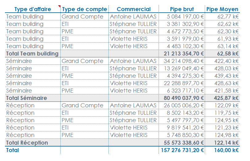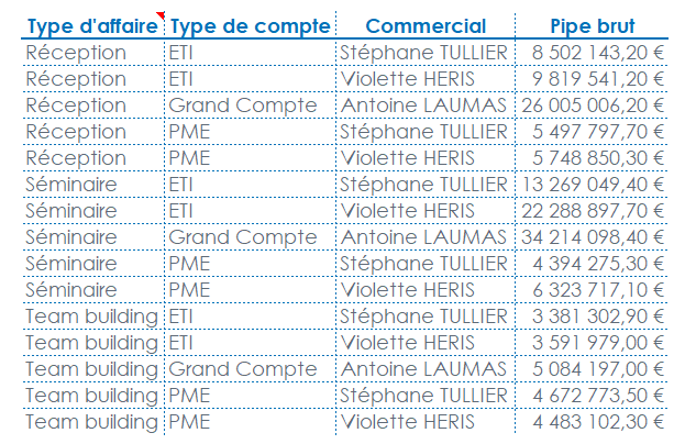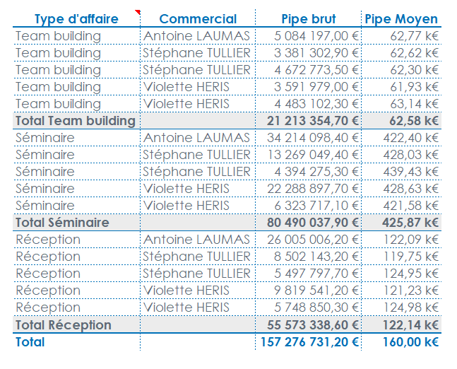 Aoutez un sous-total sur le champ « Type d'affaire » pour avoir la somme du Pipe brut des Types d'affaire.