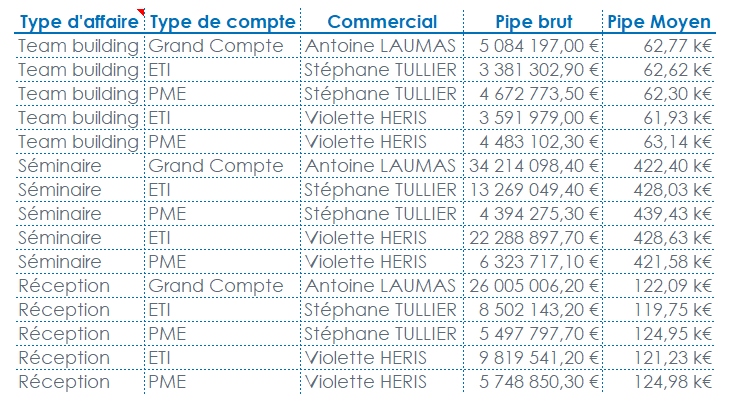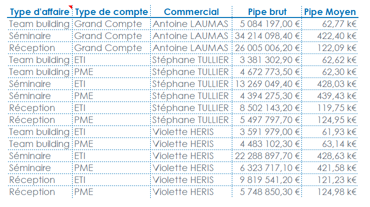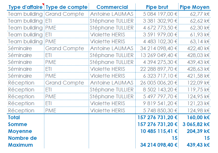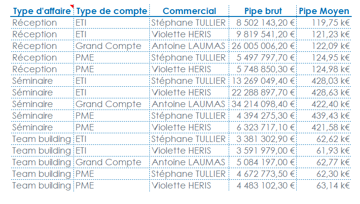 L’objectif est de créer un listing présentant la somme ET la moyenne du « Pipe brut », trié par « Commercial » croissant (tri de A à Z), et par « Type d'affaire » décroissant (tri de Z à A).