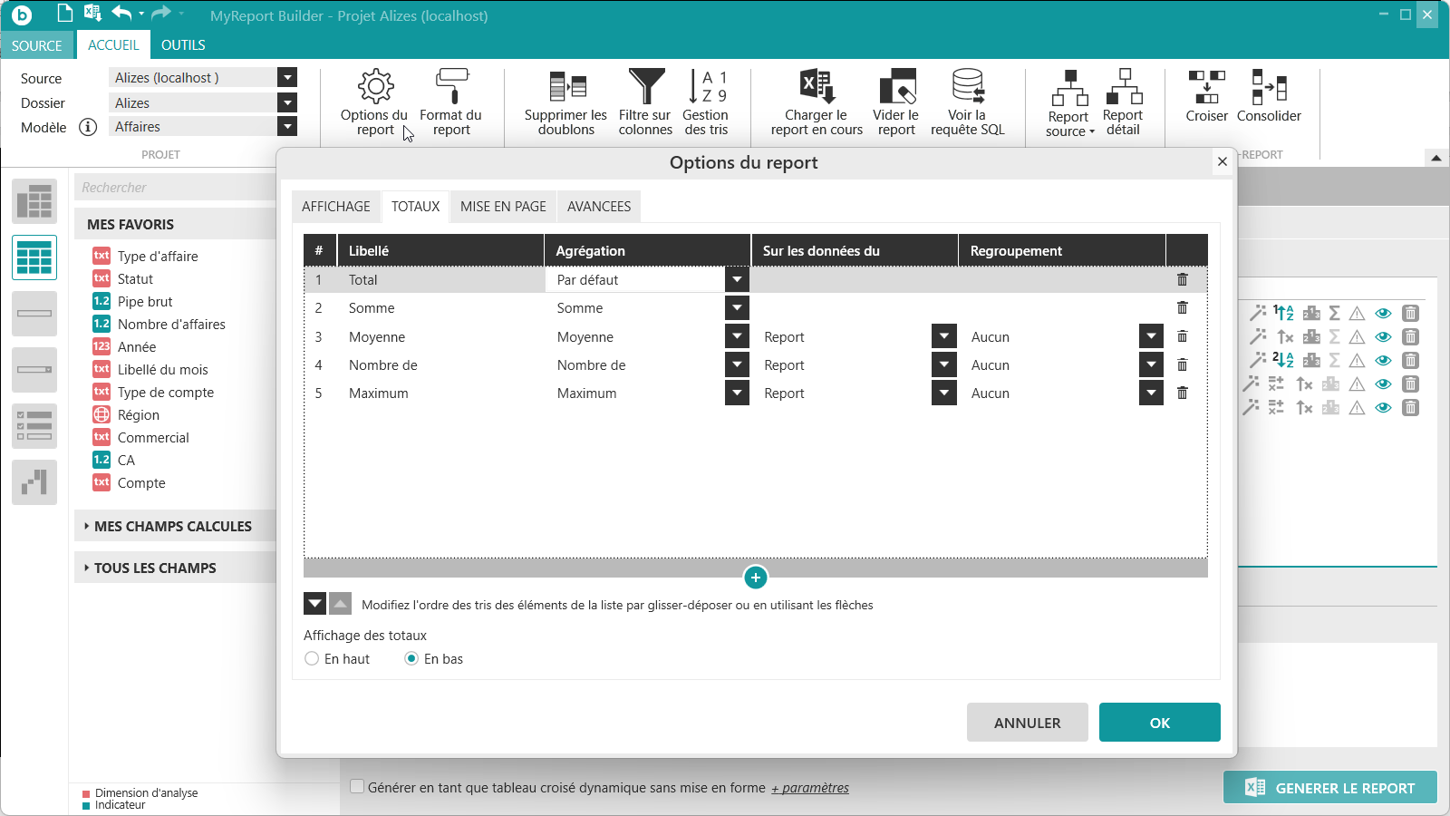 Concernant les totaux, vous trouverez plus de fonctionnalités dans les Options du report dans l'onglet Totaux.