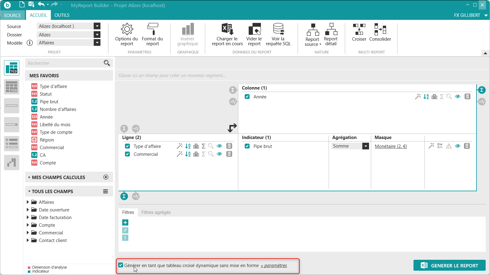 Soit en cochant l’option Générer en tant que tableau croisé dynamique sans mise en forme disponible en bas de MyReport Builder, à côté du bouton Générer le report :