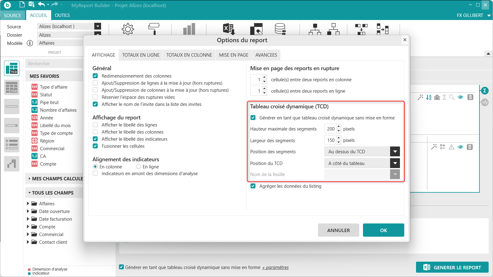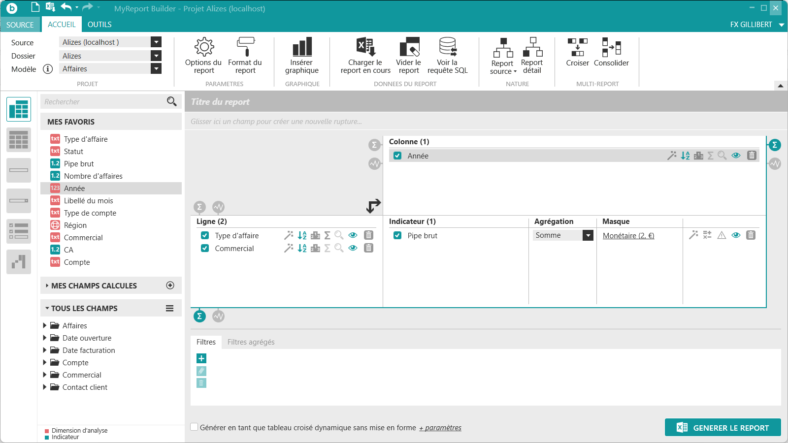située tout en haut à gauche de MyReport Builder. Positionnez dans votre report les champs suivants du modèle Affaires :