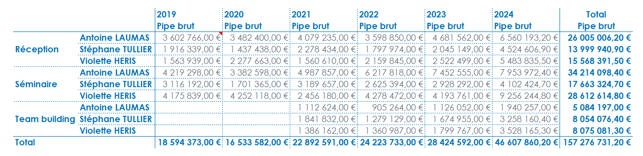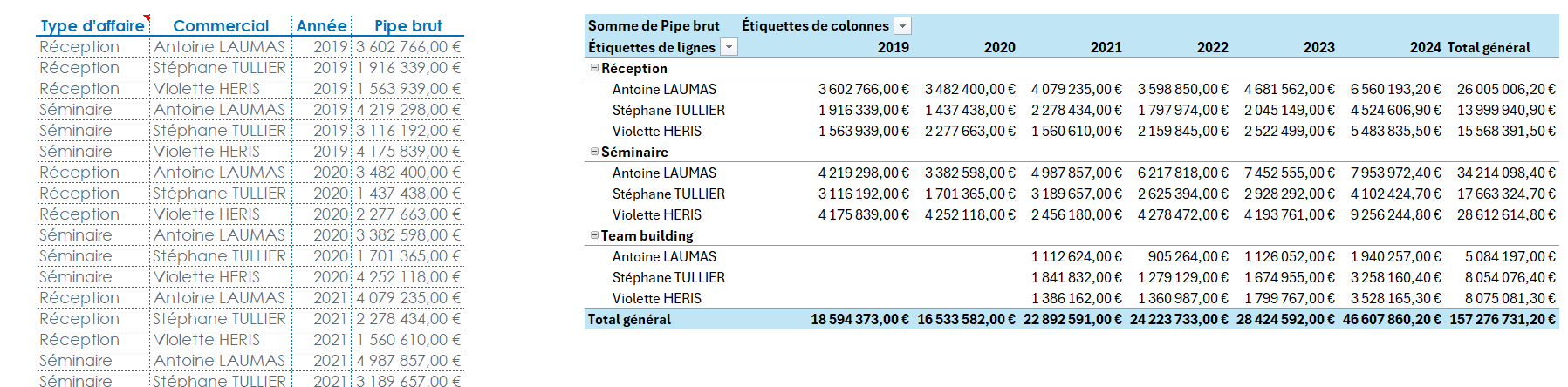 Le TCD est aussi automatiquement rempli, il correspond au paramétrage de notre report tableau.