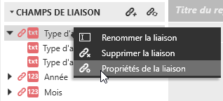 Pour modifier le nom ou les champs constituant un champ de liaison, effectuez un clic droit sur le champ de liaison et sélectionnez « Propriétés de la liaison ».