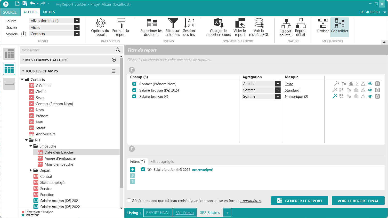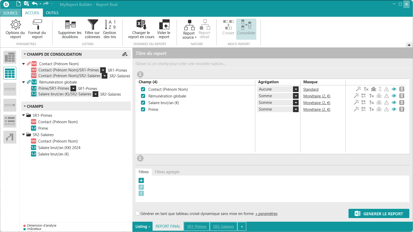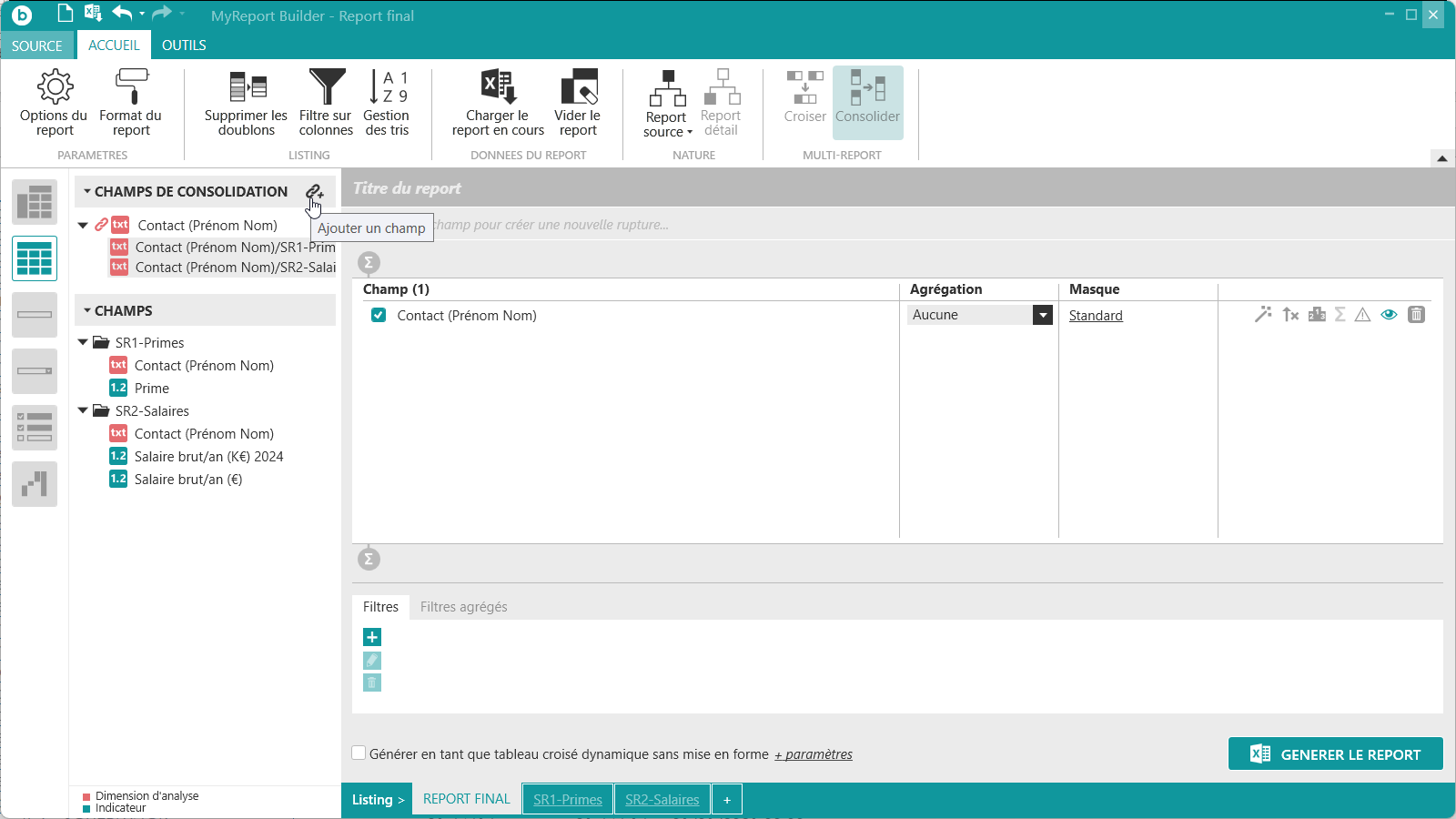 Seul le champ « Contact (Prénom Nom) » est dans la partie « Champs de consolidation » car ce dernier était nommé à l’identique dans vos deux sous-reports. En revanche, pour le Salaire et la Prime, vous allez devoir consolider les 2 champs.