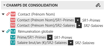 Sur le « Champ 2 » proposé, sélectionnez le champ « Prime » du SR1-Primes et le champ « Salaire brut/an (€) » du SR2-Salaires, puis renommez la consolidation en « Rémunération globale ».