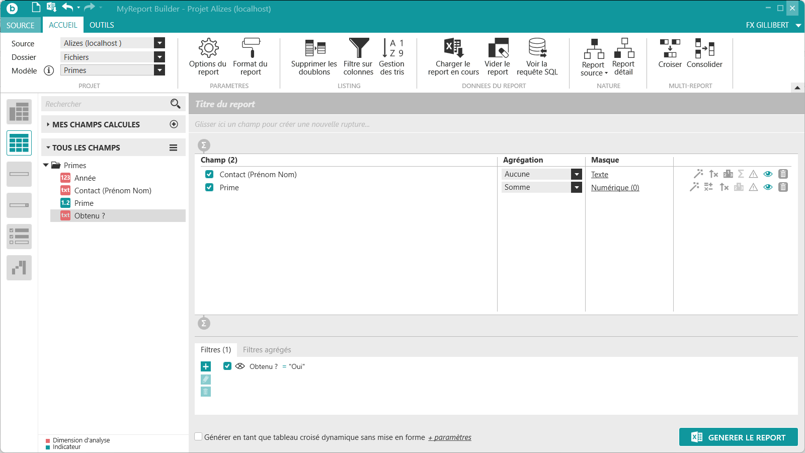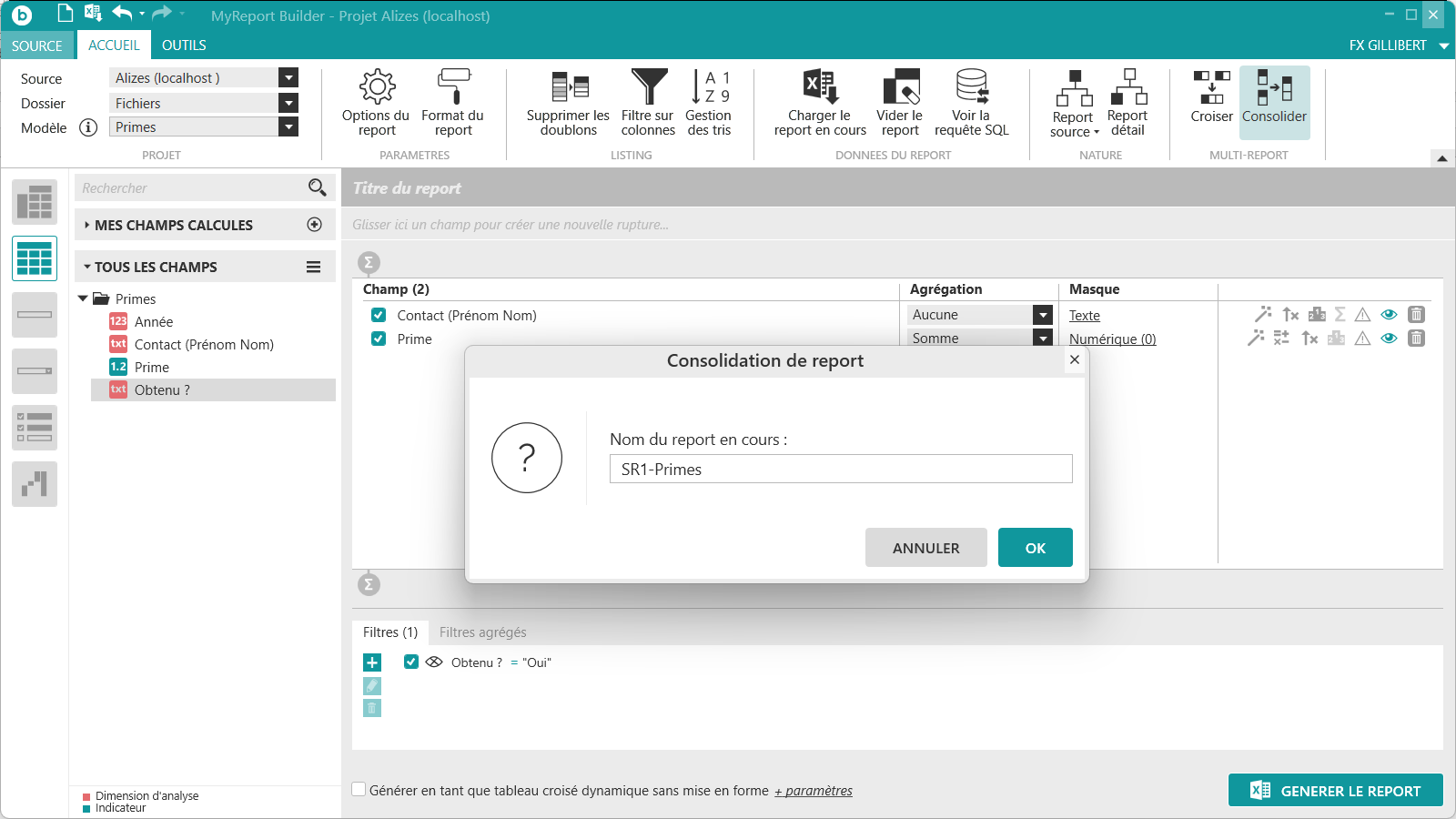 Les données étant dans 2 modèles différents, vous allez créer un Multi-report Consolidé à partir du modèle Primes (du dossier Fichiers) et du modèle Contacts (du dossier Alizes).