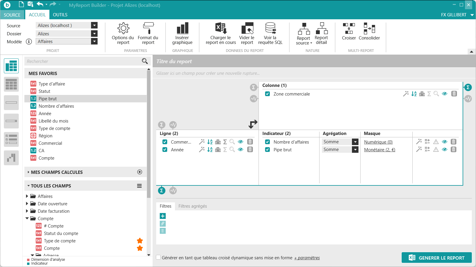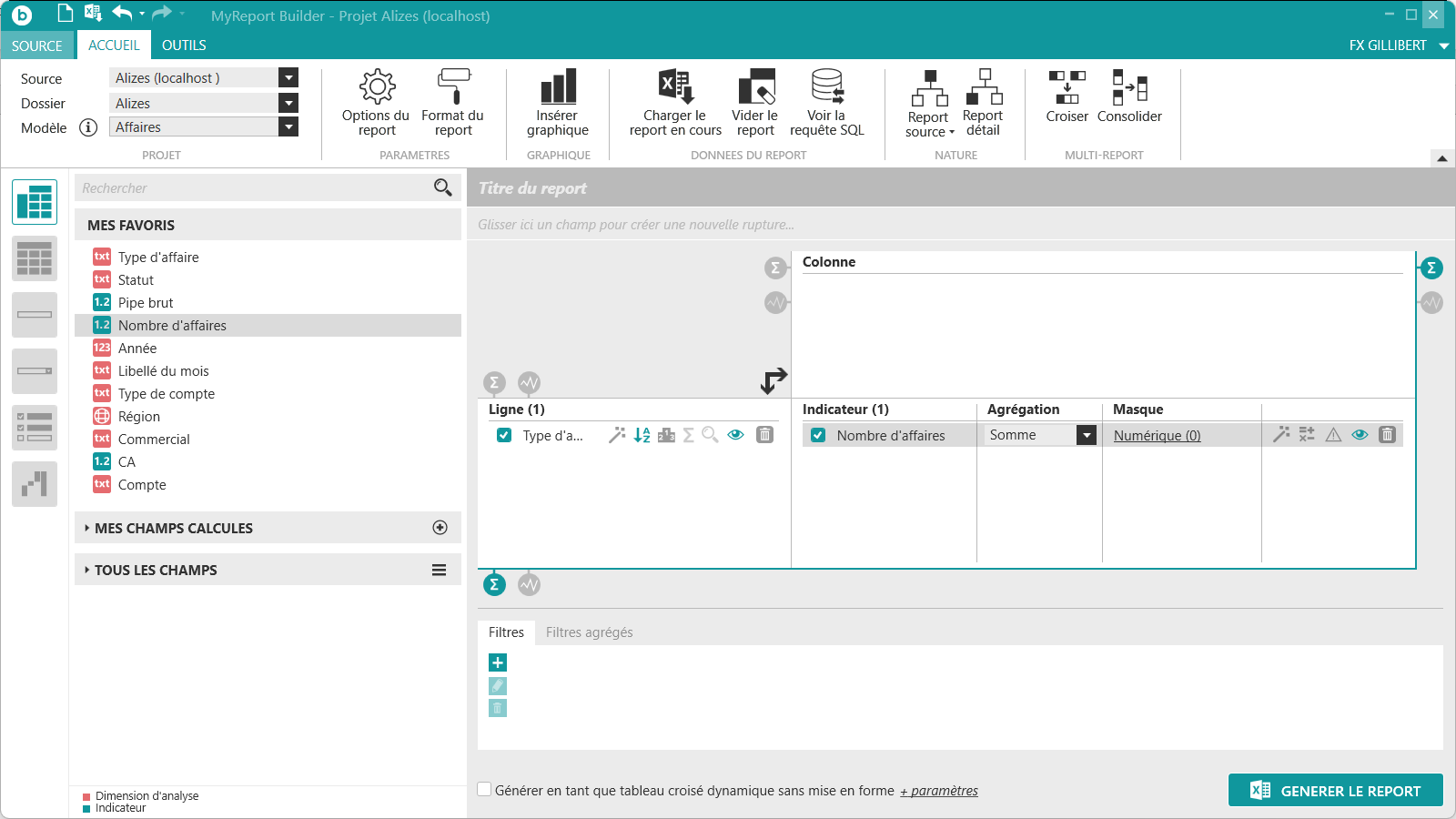 située tout en haut à gauche de MyReport Builder. Positionnez dans votre report les champs suivants du modèle Affaires :