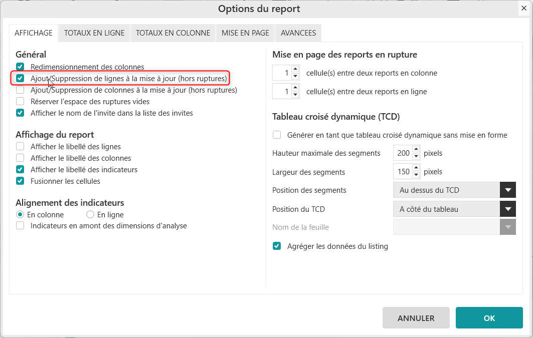 Cette option permet d'ajuster automatiquement la taille des reports, en ajoutant / supprimant des lignes / colonnes pour que la taille du report évolue.