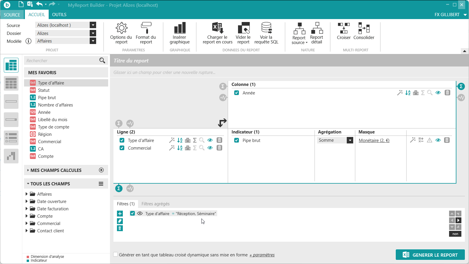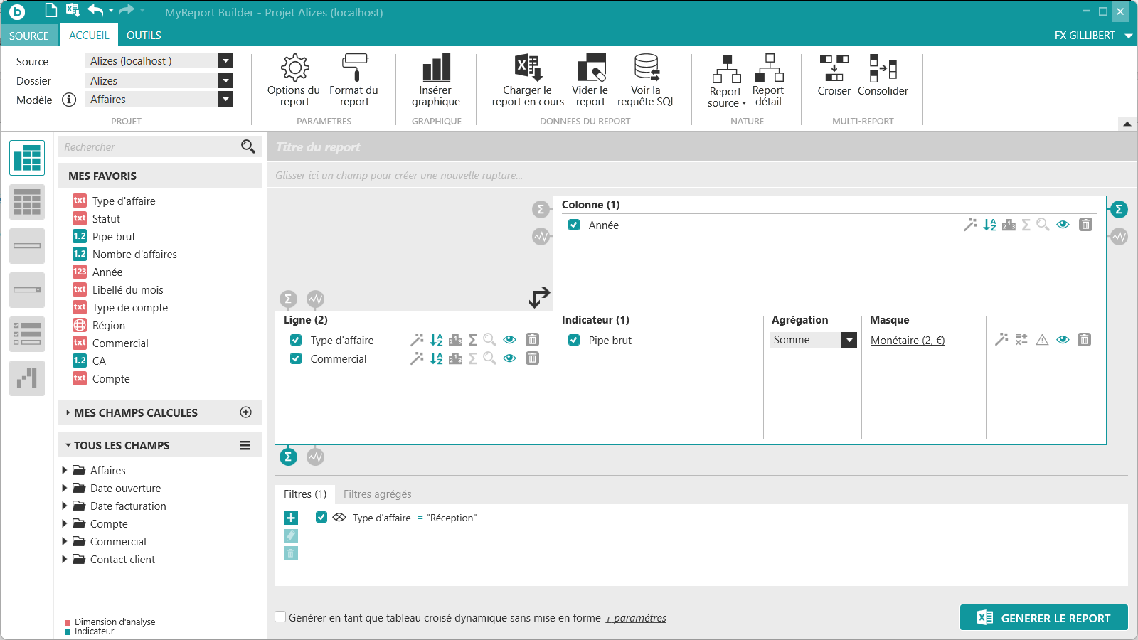 située tout en haut à gauche de MyReport Builder. Positionnez dans votre report les champs suivants du modèle Affaires :