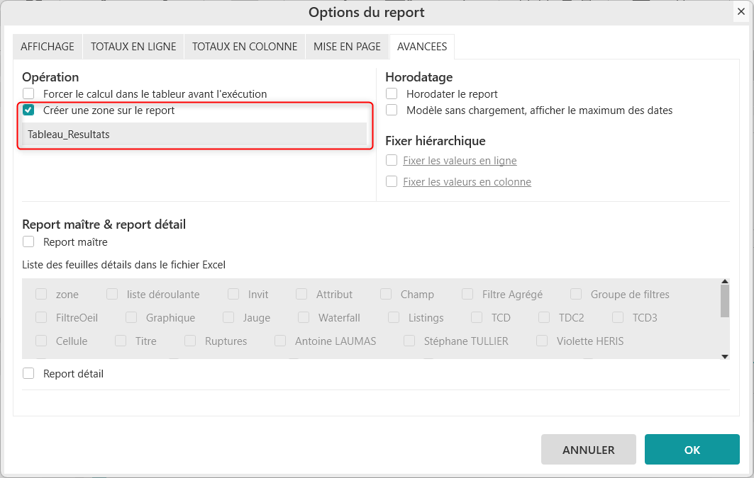 La création d’une zone et la définition de son nom s'effectue depuis « Options du report », onglet « Avancées ».