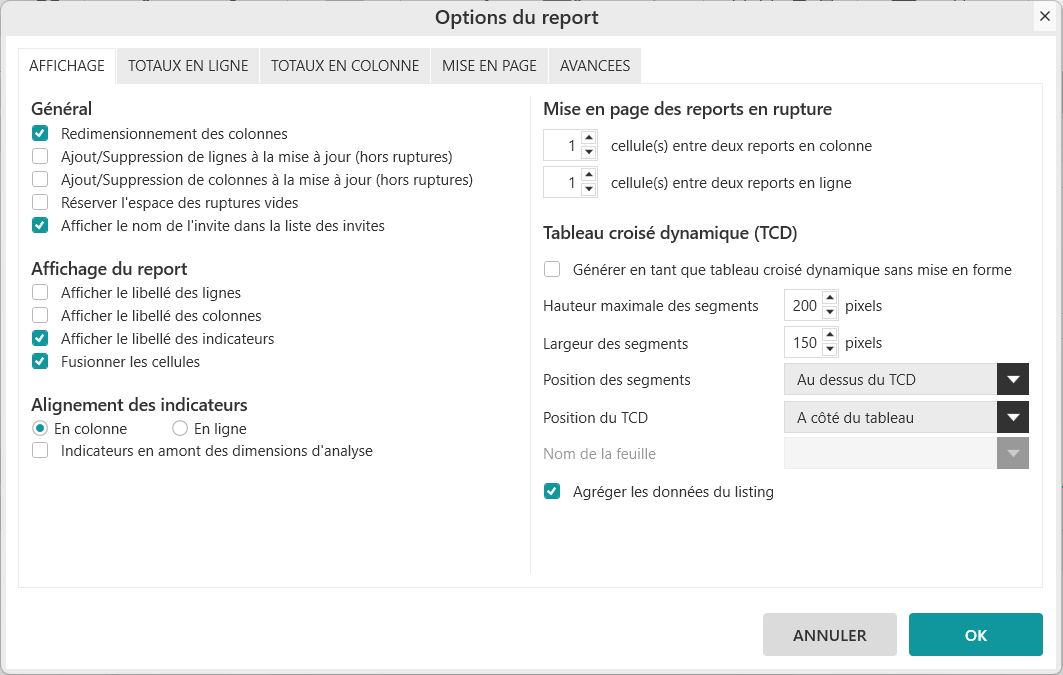 Ces options permettent d’afficher ou non les libellés des dimensions et des indicateurs en tête de tableau.