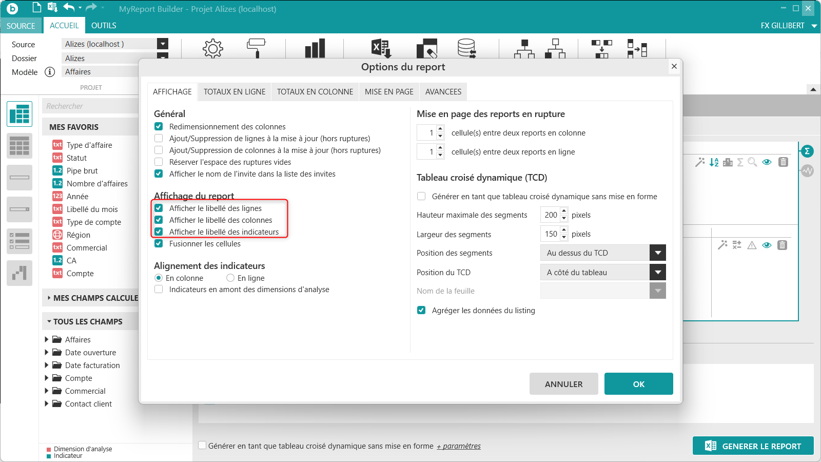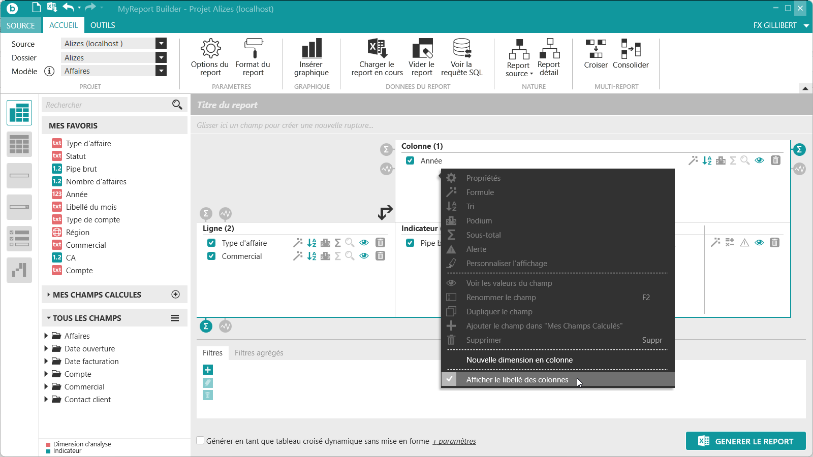 située tout en haut à gauche de MyReport Builder. Positionnez dans votre report les champs suivants du modèle Affaires :
