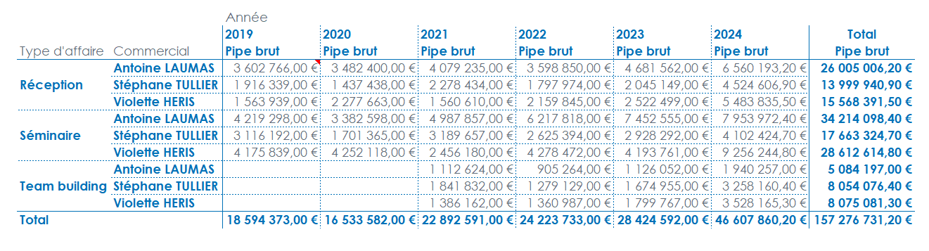 Les libellés des lignes, des colonnes et des indicateurs sont affichés en tête de tableau.