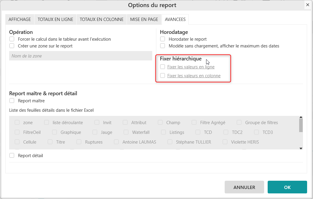 Allez dans les « Options du report », onglet « Avancées », cochez « Fixer les valeurs en ligne » et cliquez sur le texte souligné pour ouvrir le menu de configuration du fixer hiérarchique.