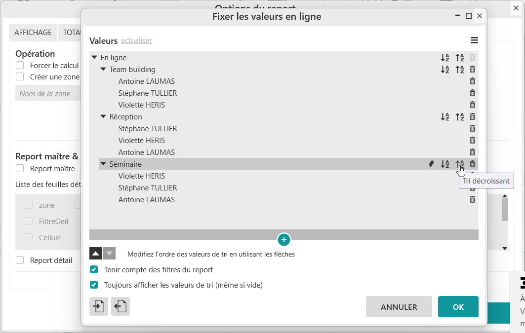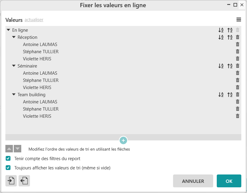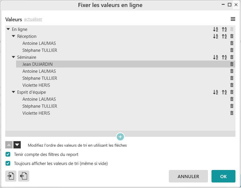 Fixer les valeurs des dimensions en ligne ou colonne permet de définir un ordre personnalisé pour l’ensemble des valeurs des champs positionnés en ligne ou en colonne.