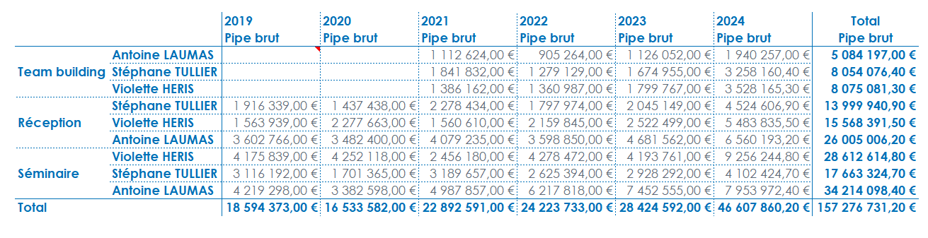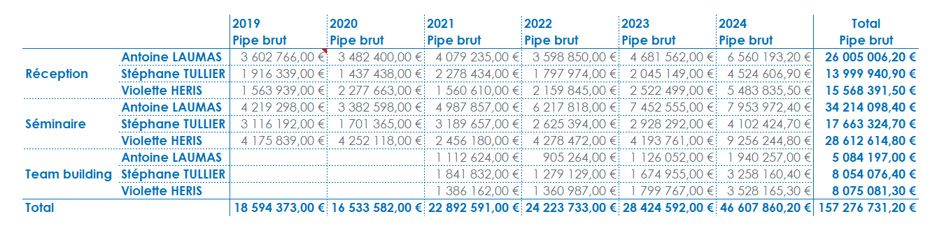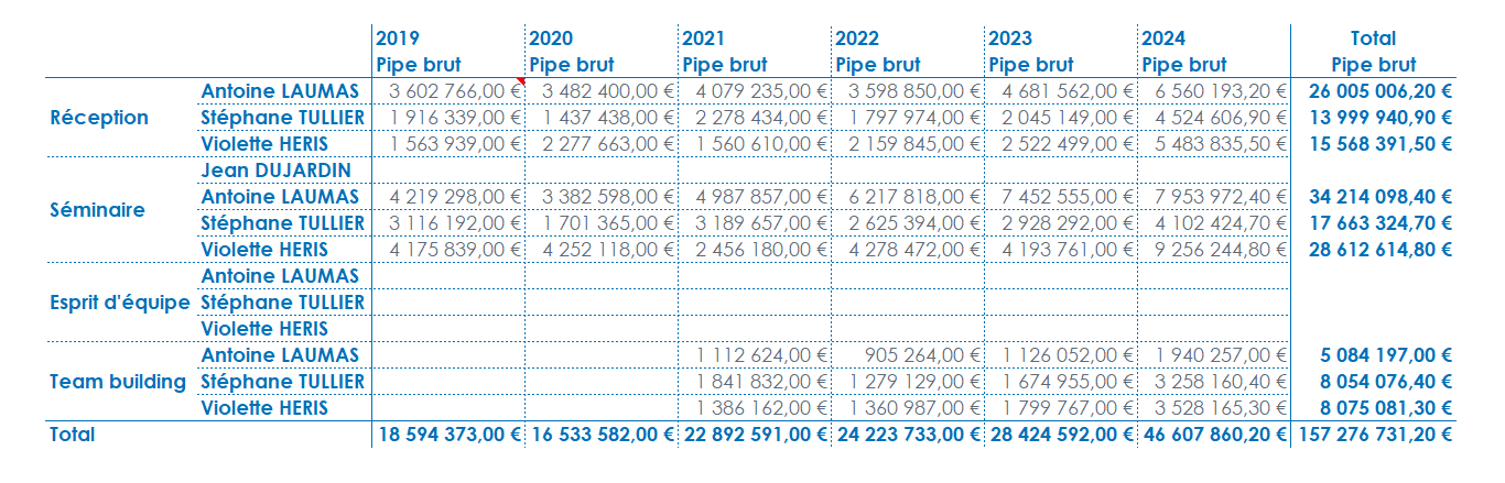 Les lignes pour le Type d'affaire « Esprit d'équipe »  et pour le commercial « Jean DUJARDIN » ne sont pas affichées, puisqu'elles sont vides.