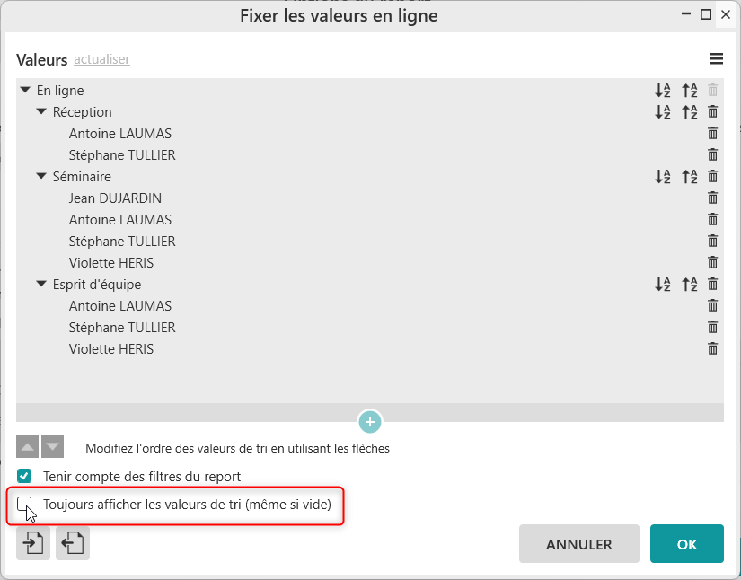 Lorsque l’option « Toujours afficher les valeurs de tri (même si vide) » est cochée, les libellés pour lesquels aucune valeur n’est présente en base sont affichés.