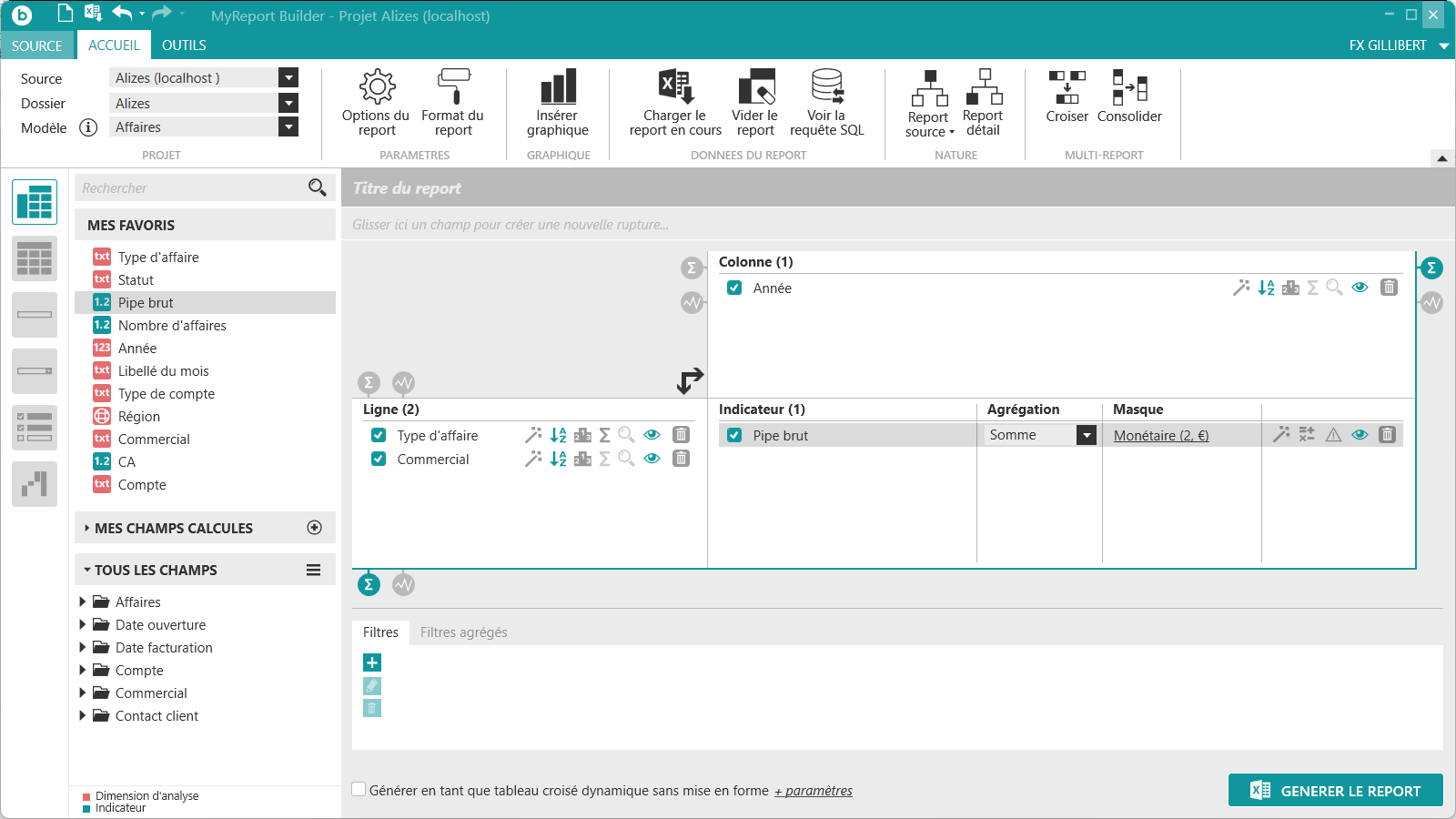 Dans MyReport Builder, cliquez sur l’icône « Nouveau report »  située tout en haut à gauche de MyReport Builder. Créez un report avec les champs suivants du modèle Affaires :