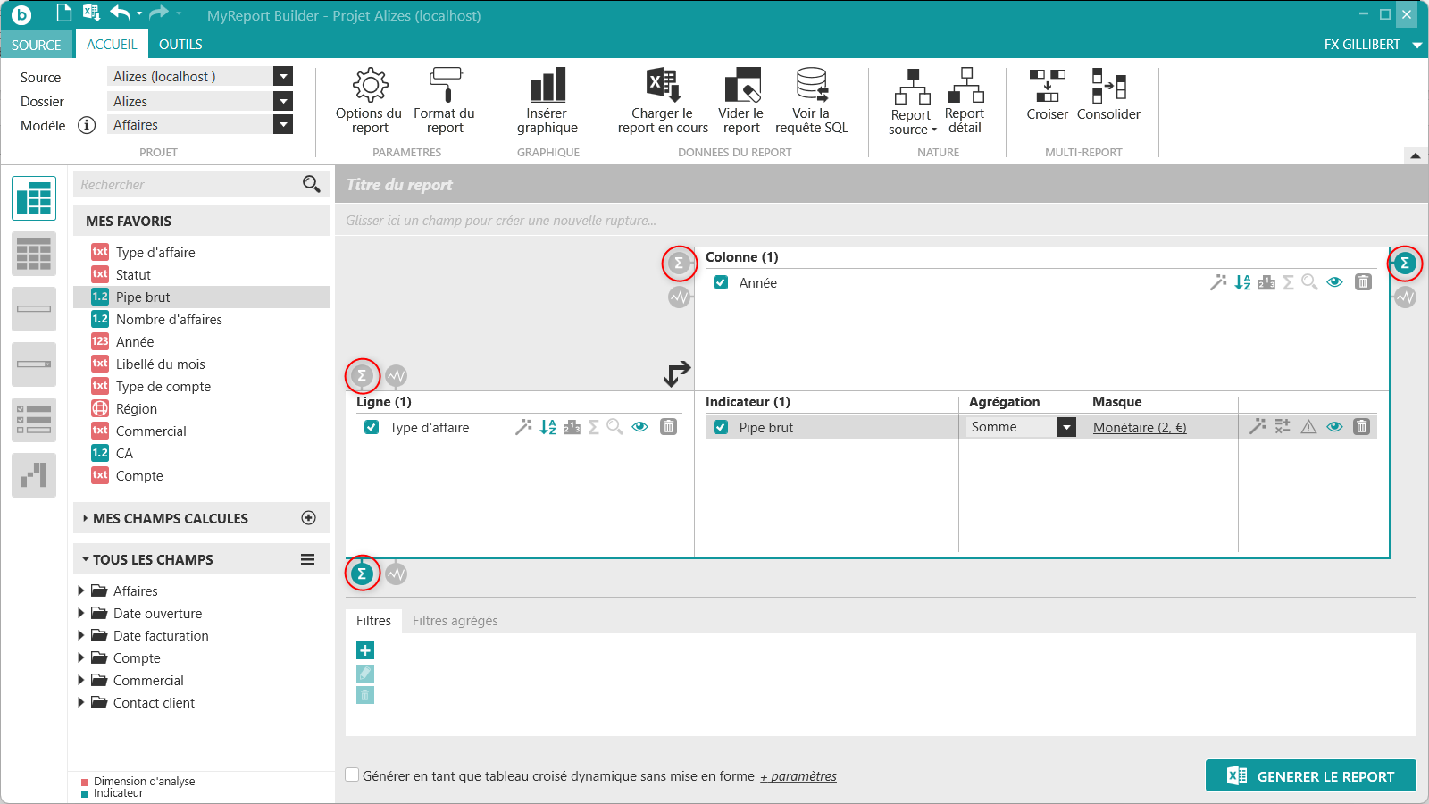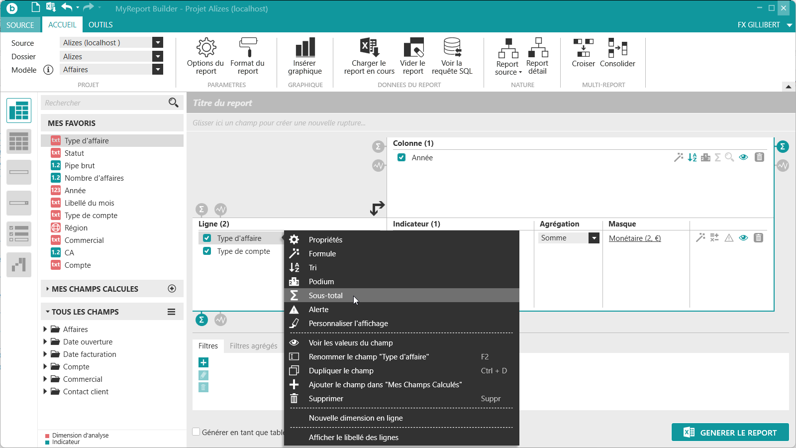 Dans MyReport Builder, cliquez sur l’icône « Nouveau report » située tout en haut à gauche de MyReport Builder. Créez un report avec les champs suivants du modèle Affaires :