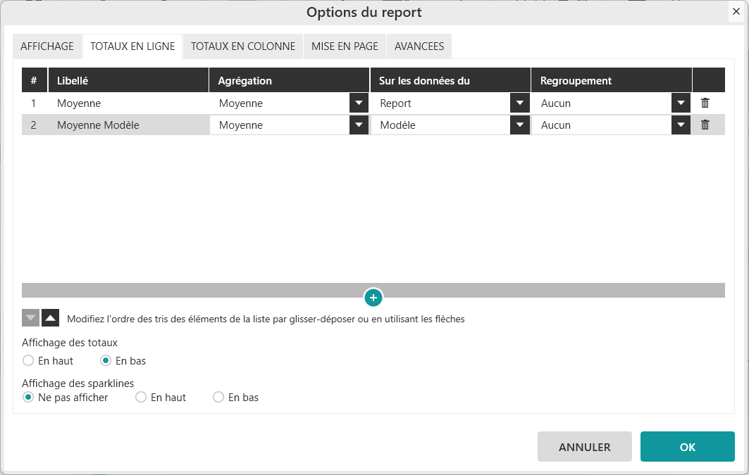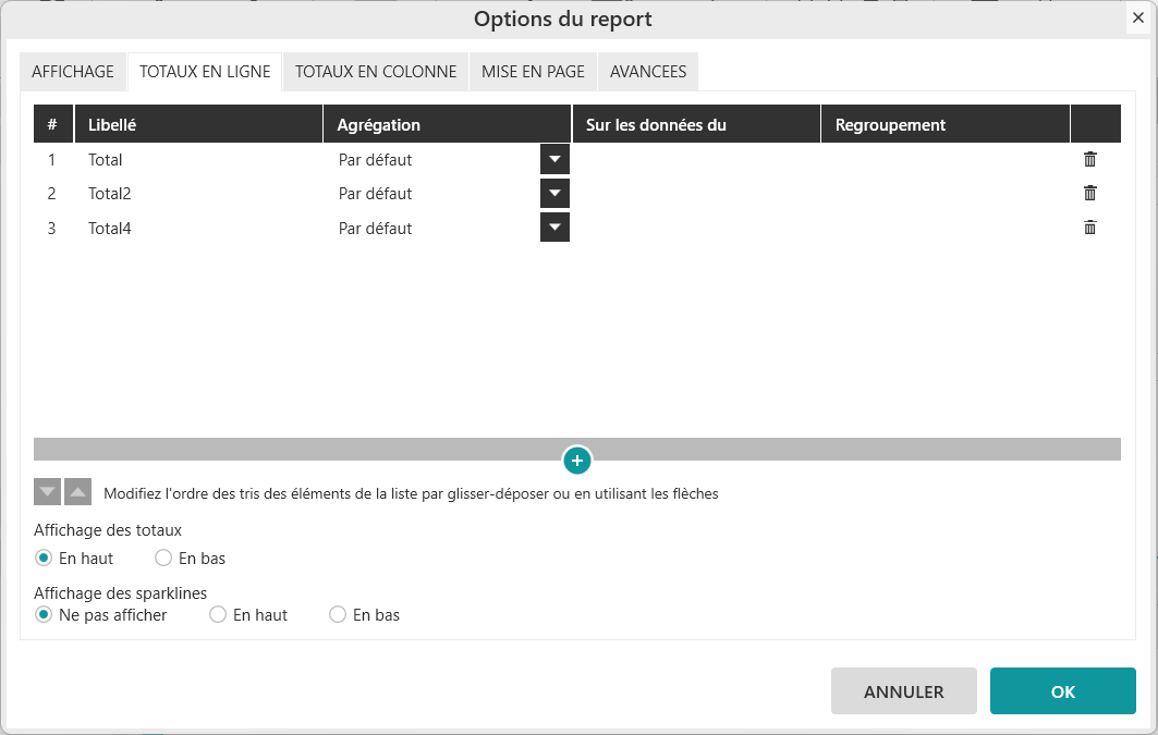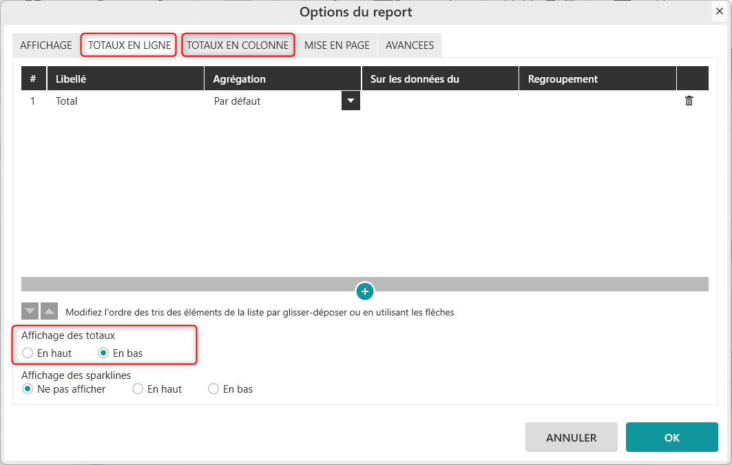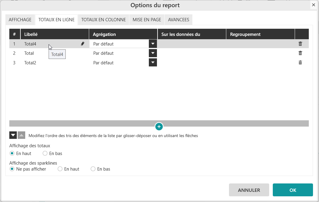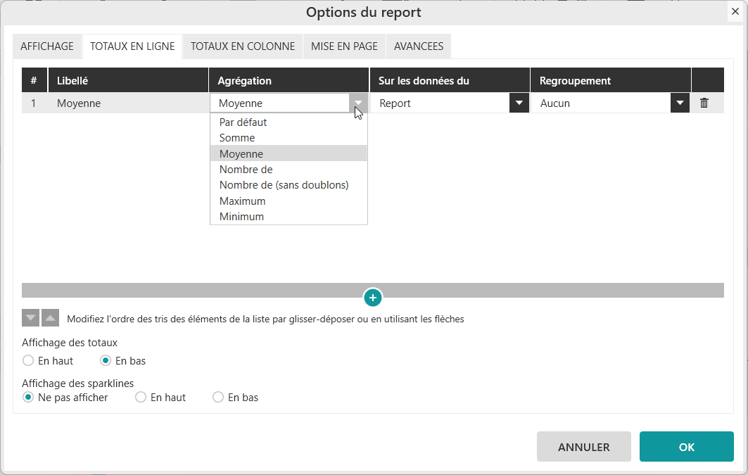 Pour modifier les totaux en ligne, allez dans « Options du report » puis dans l’onglet « Totaux en ligne ».