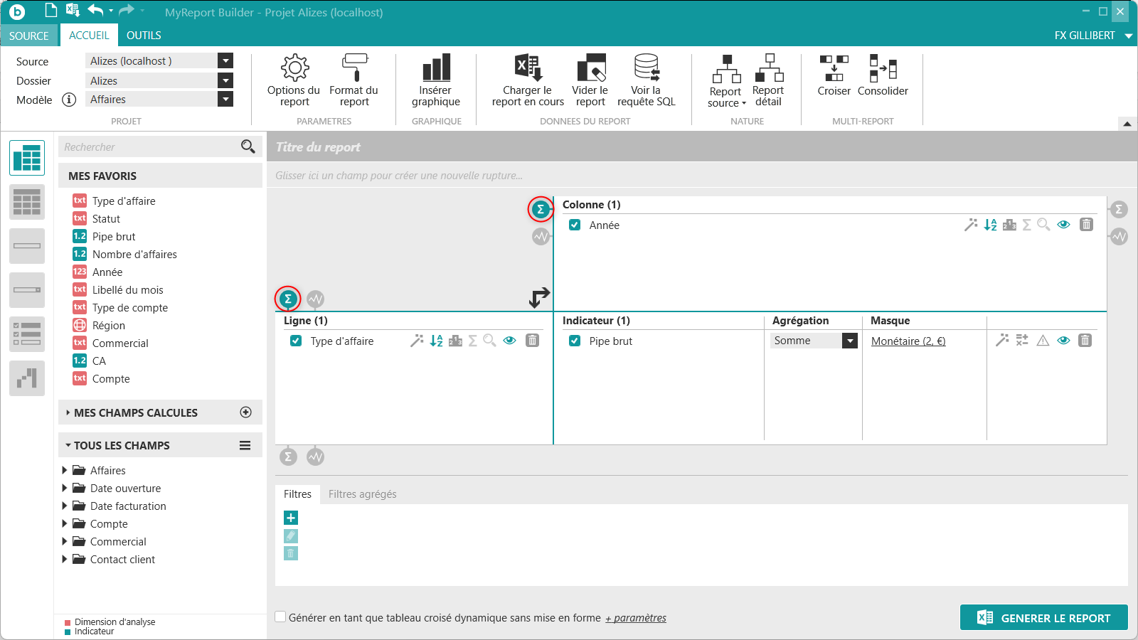 Dans MyReport Builder, cliquez sur l’icône « Nouveau report »  située tout en haut à gauche de MyReport Builder. Créez un report avec les champs suivants du modèle Affaires :