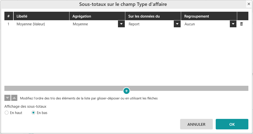 Comme pour les sous-totaux sur les champs en dimensions d’analyse, les totaux des tableaux peuvent être modifiés afin de sélectionner des agrégations autres que « par défaut », ou encore afin de changer leur positionnement.