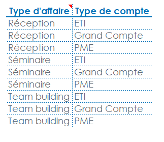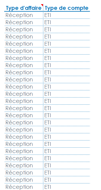 Le « Type d'affaire » et le « Type de compte ». Ces champs étant de type Dimension d'analyse, aucune agrégation par défaut n'est effectuée. Les valeurs sont répétées autant de fois qu'il y a d'enregistrements dans la base de données.