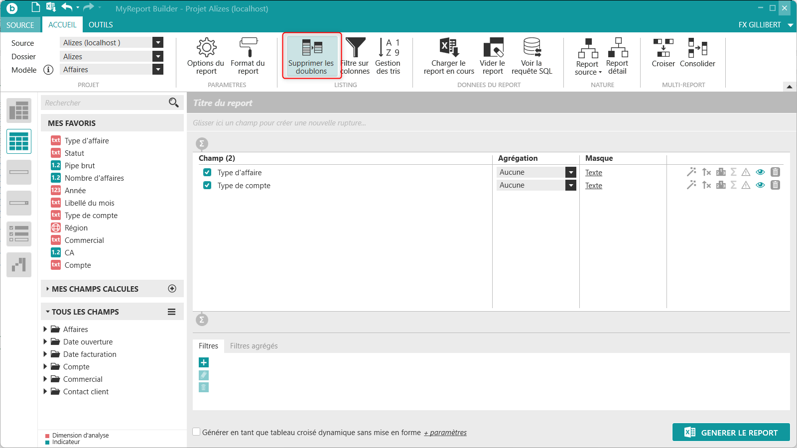 située tout en haut à gauche de MyReport Builder. Créez un report Listing avec uniquement les champs suivants du modèle Affaires :