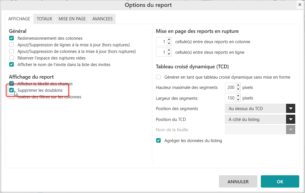 L’option « Supprimer les doublons » permet de n’afficher qu'une seule fois un ensemble de valeurs.