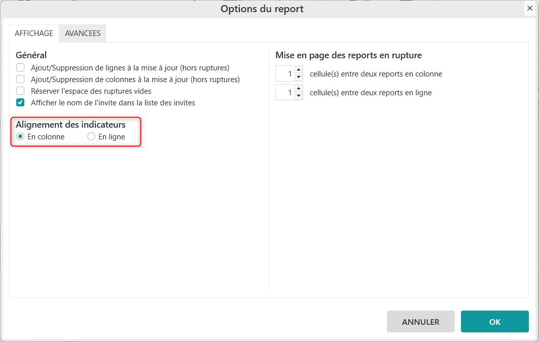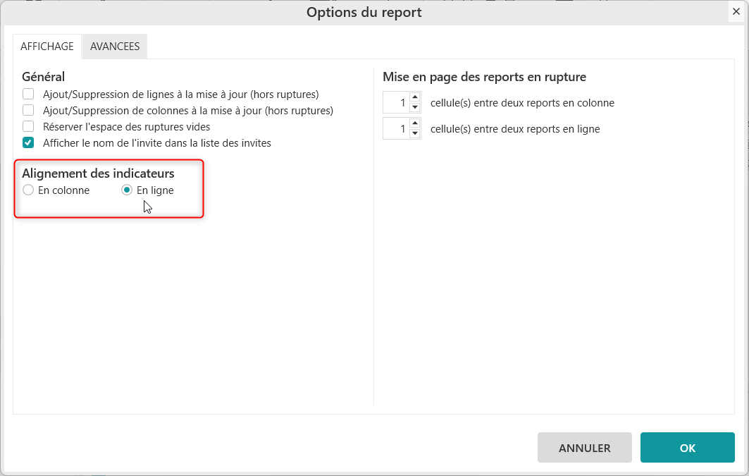 Cette option permet de choisir si les indicateurs seront affichés côte à côte (affichage par défaut « En colonne ») ou les un en dessous des autres (« En ligne »)