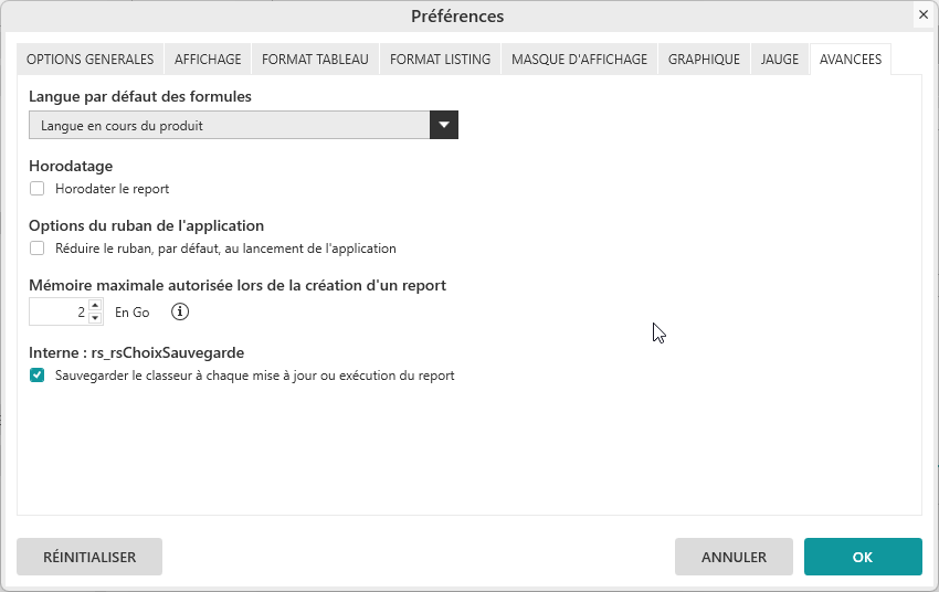 Cette option, située dans l'onglet Avancées, permet de réduire le ruban dans MyReport Builder (menus « Accueil » et « Outils »).