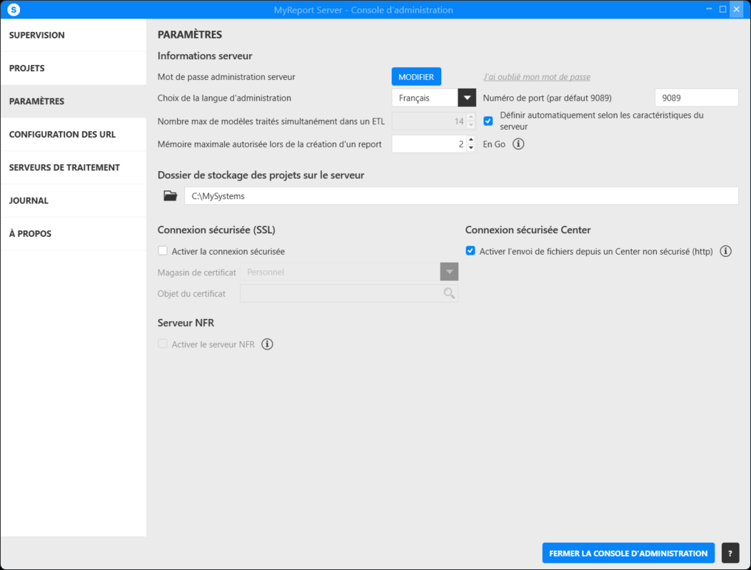 - Connexion sécurisée Center : permet l'envoi le téléchargement de fichiers sources depuis MyReport Center en http.