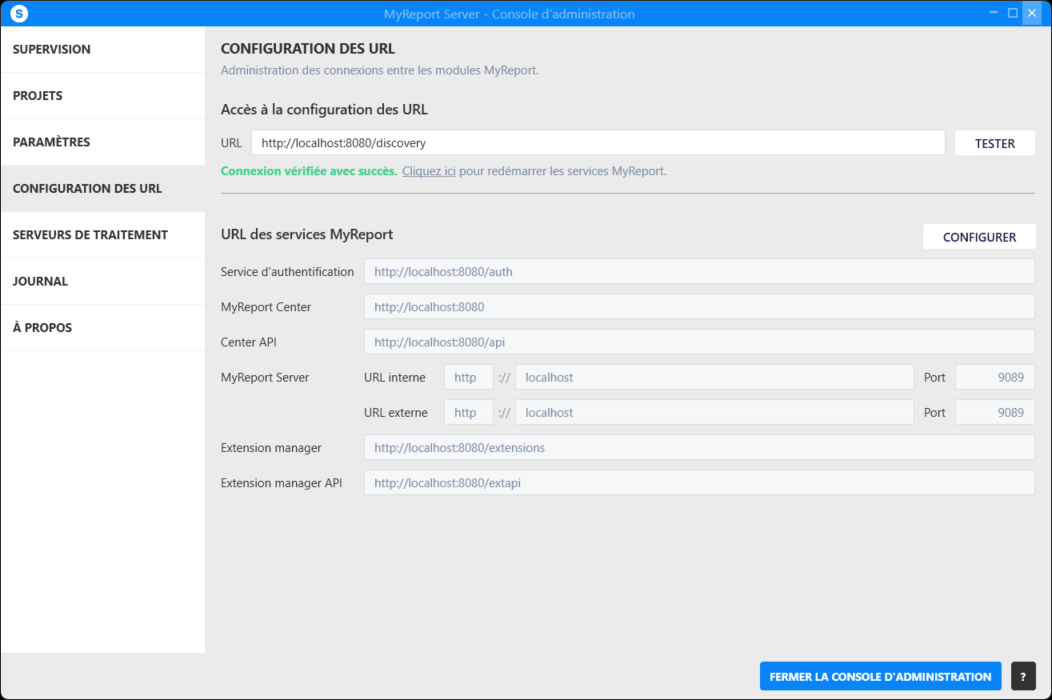 Après avoir testé la configuration des URL, un lien « Cliquez ici pour redémarrer les services MyReport » permet, si besoin, d'arrêter et de redémarrer MyReport Server (et éventuellement de prévenir les utilisateurs connectés).