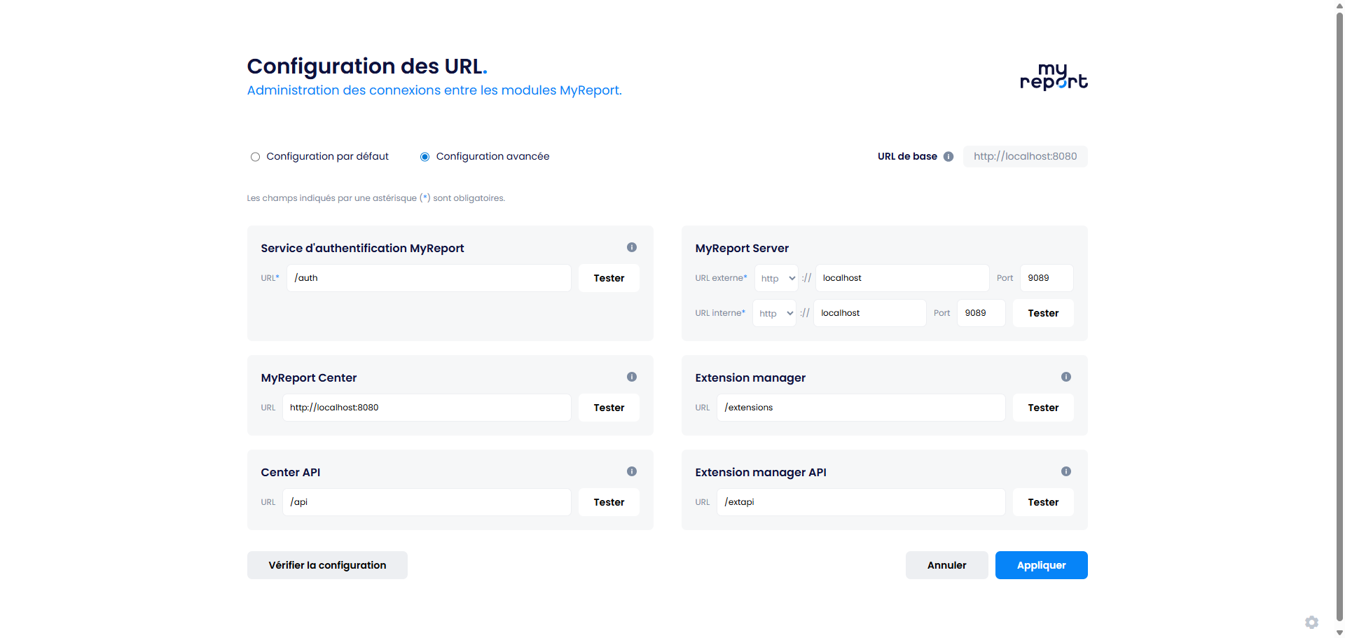 La page « Configuration avancée » permet de modifier et tester l'adresse du Service d'authentification MyReport, les URL externe et interne de MyReport Server, l'URL de MyReport Center, l'URL de l'extension manager, l'URL du Center API et l'URL de l'extension manager API.