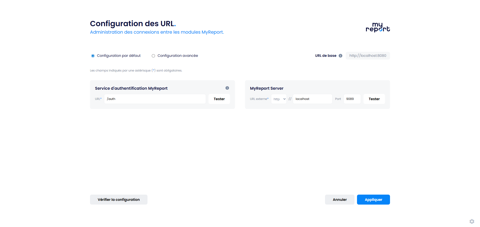 La page « Configuration par défaut » permet de modifier et tester l'adresse du Service d'authentification MyReport et l'URL externe de MyReport Server.