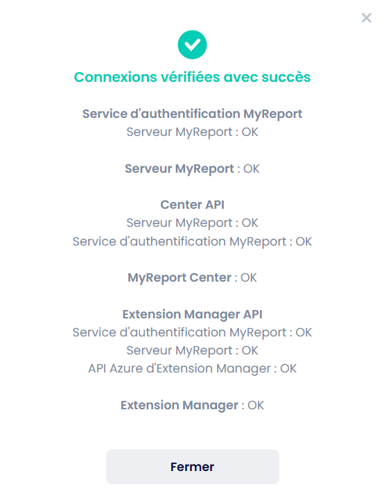 Vous retrouvez ici les URL du Service d'authentification, de MyReport Center, du Center API, les URL interne et externe de MyReport Server, des extensions Manager et de son API.