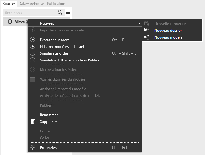 Dans la partie « Sources », faites un clic droit sur la connexion « Alizes » et sélectionnez « Nouveau >> Nouveau modèle ».