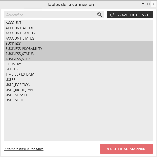 Dans la fenêtre « Tables de la connexion » qui apparaît, cliquez sur le bouton « Actualiser les tables » et à l’aide de la touche « Ctrl » de votre clavier sélectionnez les tables « BUSINESS », « BUSINESS_PROBABILITY », « BUSINESS_STATUS » et « BUSINESS_STEP ».
