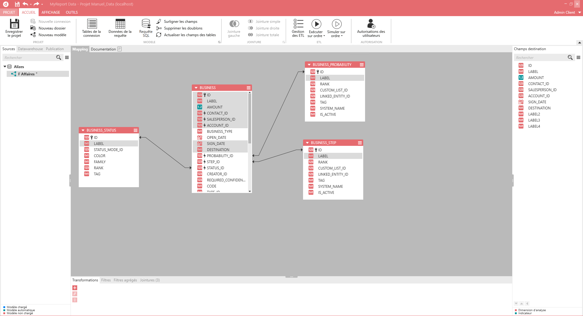 Placez-vous dans le modèle « F Affaires » de la connexion « Alizes », puis double-cliquez sur le champ « ID » de la table « BUSINESS ». Ce champ s’ajoute alors à la liste des champs destination.