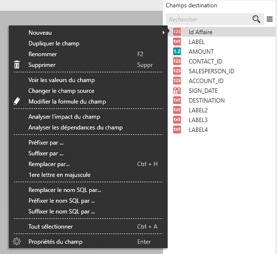 Cliquez droit sur le champ « ID » dans « l’espace des champs destination », puis sélectionnez « Renommer ».