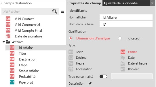 Par défaut, un champ de type « Décimal » sera considéré comme un « Indicateur », et non comme une « Dimension d’analyse ».