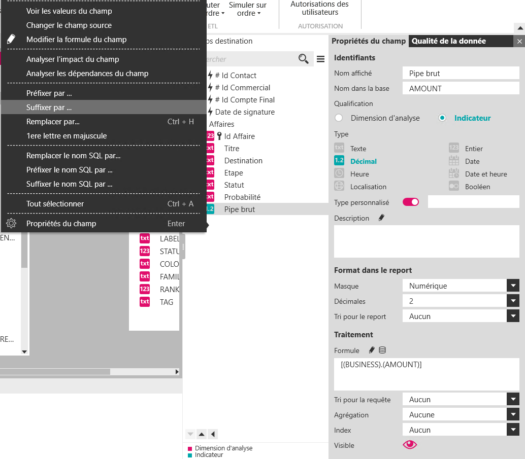 Pour modifier un ou plusieurs champs en une seule manipulation, vous pouvez utiliser les fonctions « Préfixer par » ou « Suffixer par », accessibles par clic droit sur les champs destination.