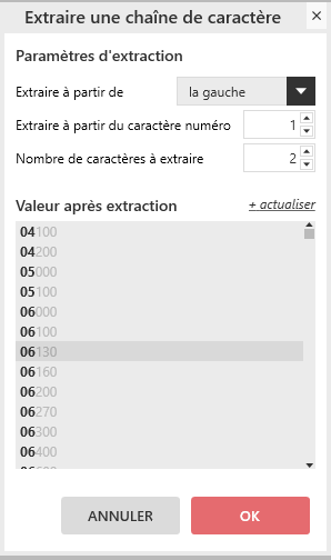 Dans la fenêtre « Extraire une chaine de caractère », extraire à partir de la gauche, à partir du caractère numéro 1 et extraire 2 caractères.