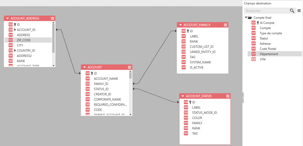 Vous allez, en utilisant une transformation assistée, créer un champ contenant le département d’un compte final à partir d’un champ contenant un code postal, en extrayant les deux premiers caractères.
