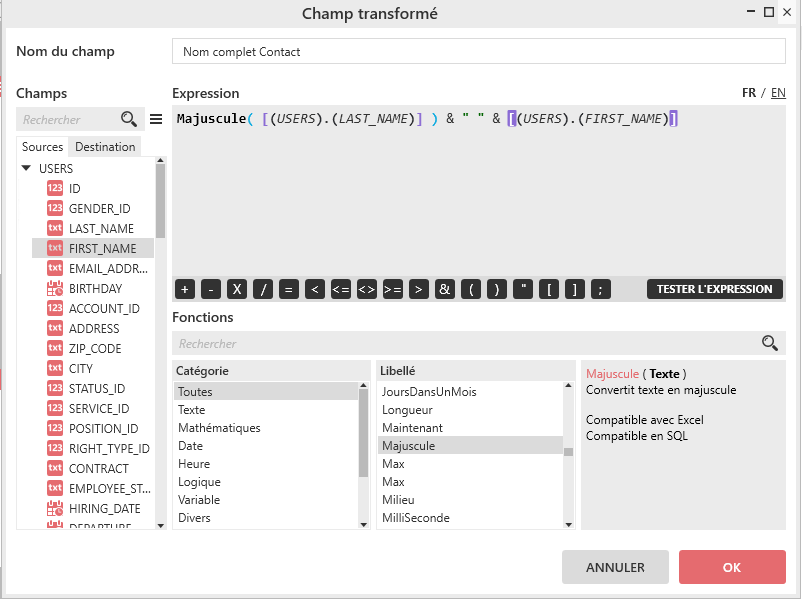 A noter : Il était également possible de rechercher la fonction dans la partie « Fonctions » de la fenêtre du « Champ transformé » et double-cliquer sur la fonction « Majuscule(Texte) » pour que cette dernière s’affiche dans la partie « Expression ».